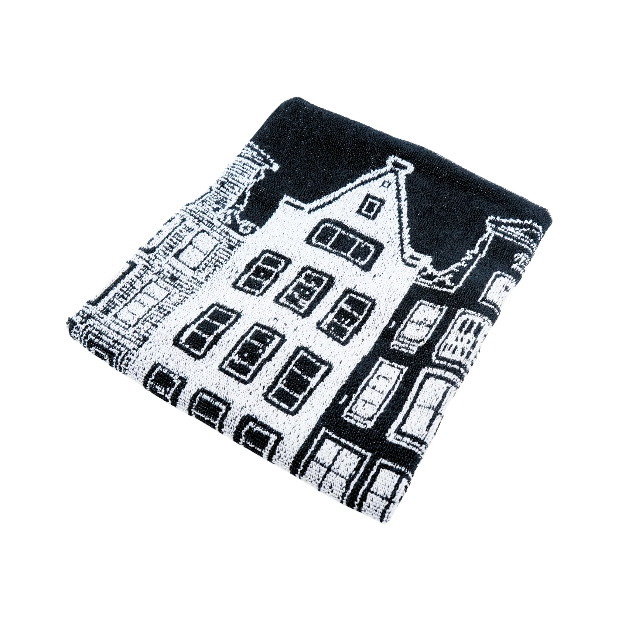 The DDDDD Canal Black Hand Towel with Red Stripe, measuring 20x22 inches, features a charming design of buildings along a canal. Its soft, absorbent fabric is perfect for drying hands or wiping spills, adding both practicality and a touch of urban elegance to your kitchen or bathroom.