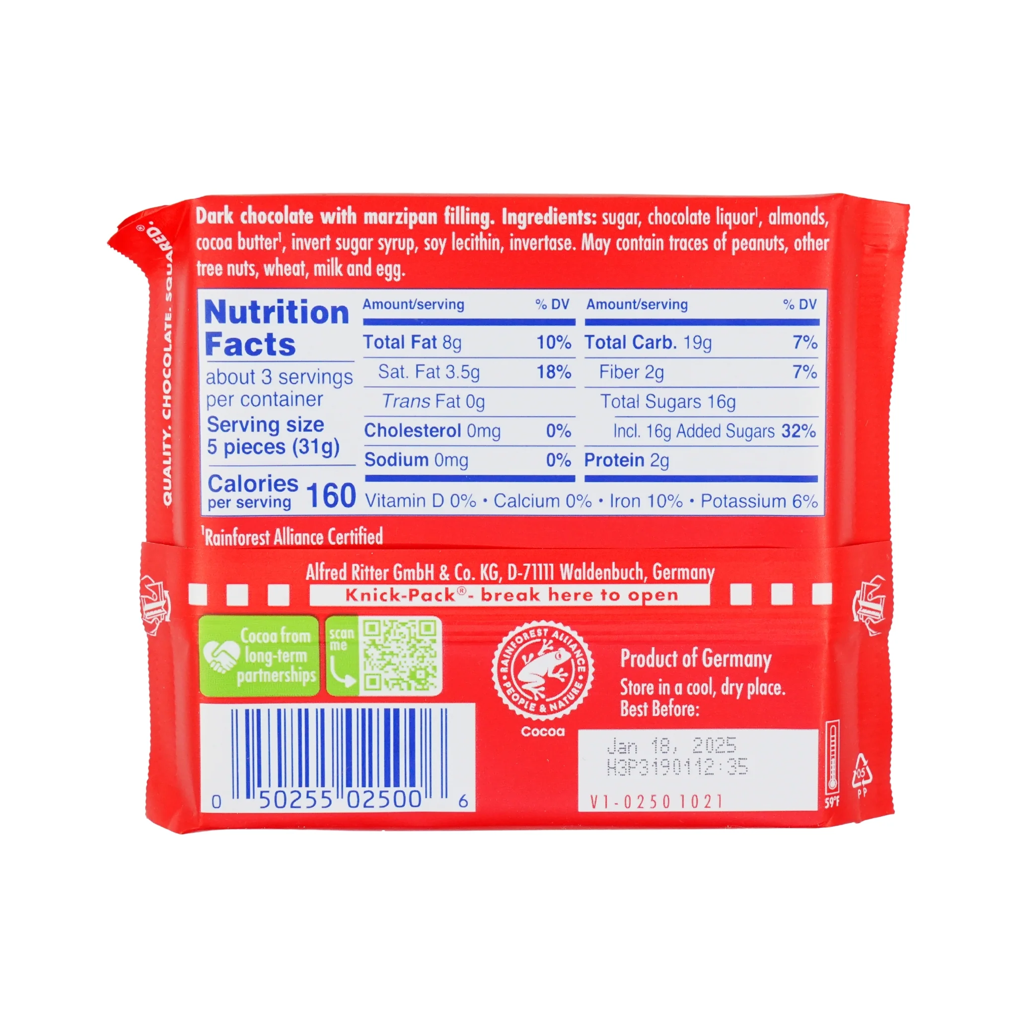 Indulge in the rich flavor of Ritter Dark Chocolate Bar with Marzipan Filling, a 3.5 oz treat combining smooth dark chocolate and sweet, nutty marzipan. Perfect for sharing or enjoying on your own, this friendly chocolate bar offers a deliciously satisfying blend of bold and sweet in every bite.